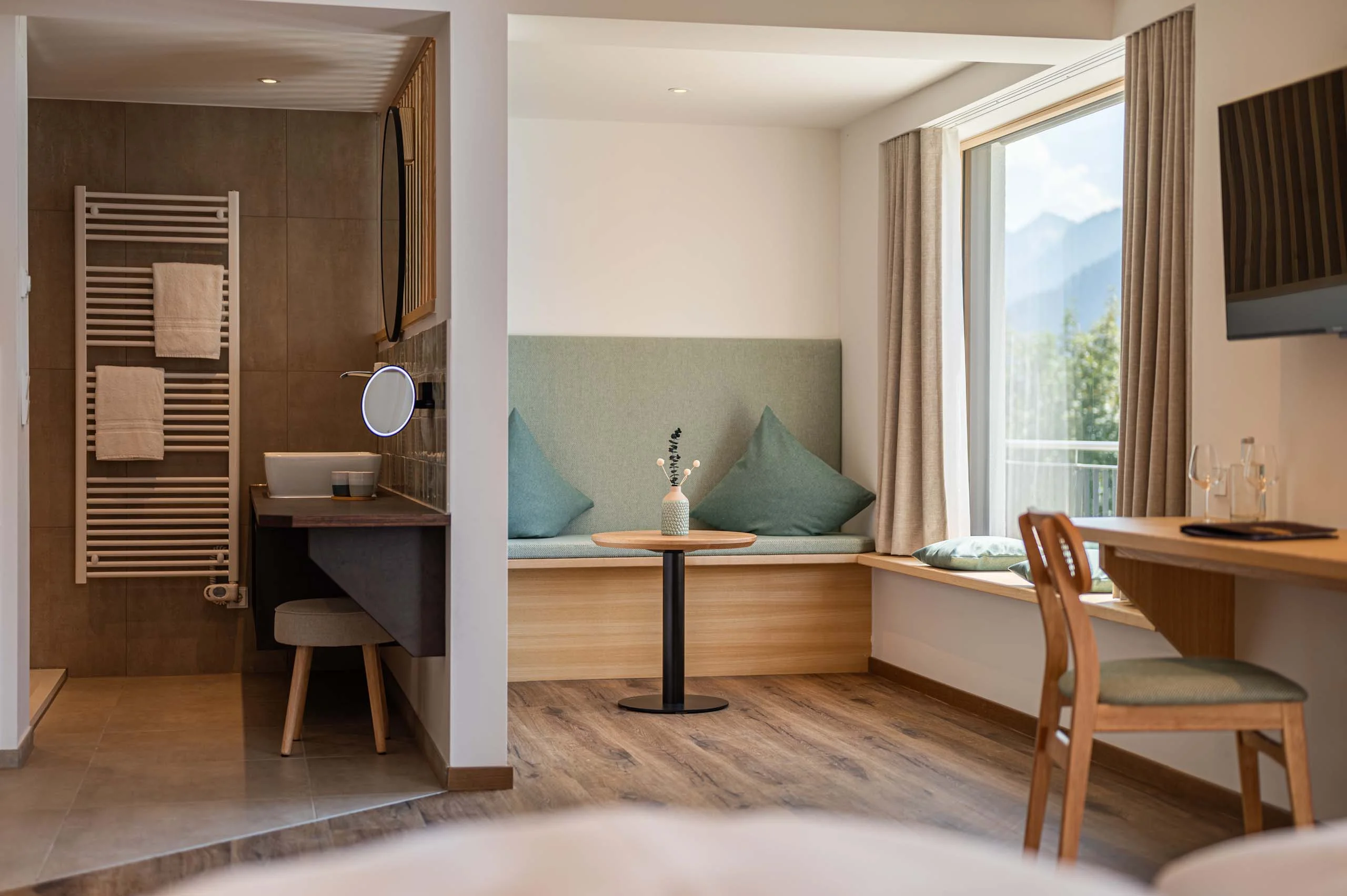 Doppelbett | gemütliche Sitzecke | Bad mit Dusche und WC | Terrasse oder Balkon mit Garten- und Bergblick
